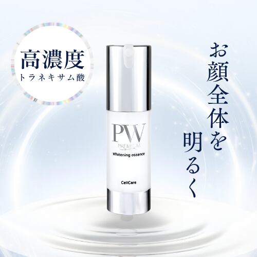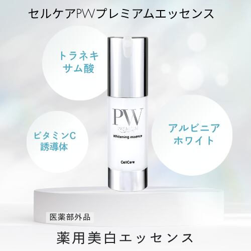 セルケアPWプレミアムエッセンス【美容液】 内容量:30ml メラニンの生成を抑え、しみ・そばかすを防ぐ薬用美容液。 トラネキサム酸をはじめ、アルピニアホワイト、クレアージュ、 ビタミンC誘導体、プラセンタを配合。 ローション使用後に、適量をお顔全体に塗布します。